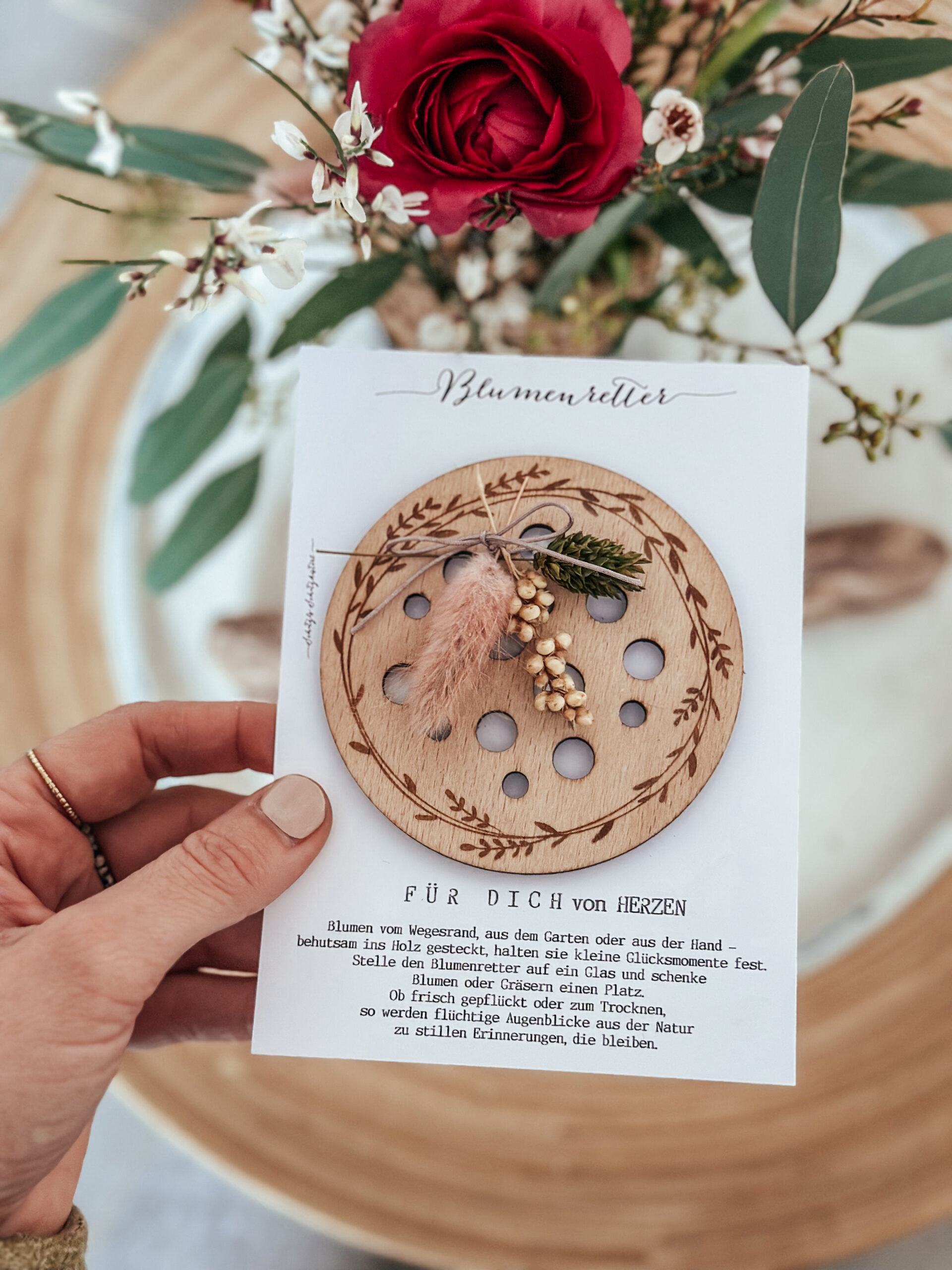 Der Blumenretter ist eine handgemachte Holz-Steckhilfe, mit der du Blumen ganz einfach neu arrangieren kannst – ganz ohne spezielle Vase.